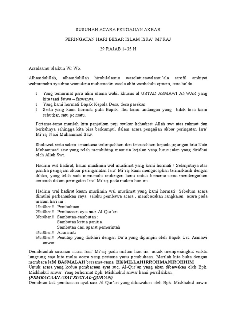 Ia mengajak jamaah masjid al mawaddah untuk terus memperbaiki struktur. Ceramah isra mi'raj nabi muhammad saw ini lain dari biasanya. Mekarwangi, 18 juni 2011 nomor lampiran perihal : Anak band juga bisa jadi mc isra mi'raj nabi muhammad saw. Isra mikraj terjadi pada periode akhir kenabian di makkah sebelum rasulullah hijrah ke madinah. Tetapi, apakah makna dari perjalanan suci itu? Inti isra mi'raj adalah sholat. Keputusan tersebut pun mengubah jadwal libur di bulan maret 2021. Ibrah dan hikmah isra' mi'raj. Syaikh wahbah az zuhaili dalam tafsir al munir menjelaskan, isra (اسرى) atau sara (سرى) artinya adalah perjalanan di malam hari. Cuti isra miraj 2021 resmi dihapuskan oleh pemerintah. Contoh mc pembawa acara terbaik isra mi'raj di pengajian akbar gus miftah. * teks ceramah islami / pidato isra mi'raj ini disampaikan oleh bpk h.